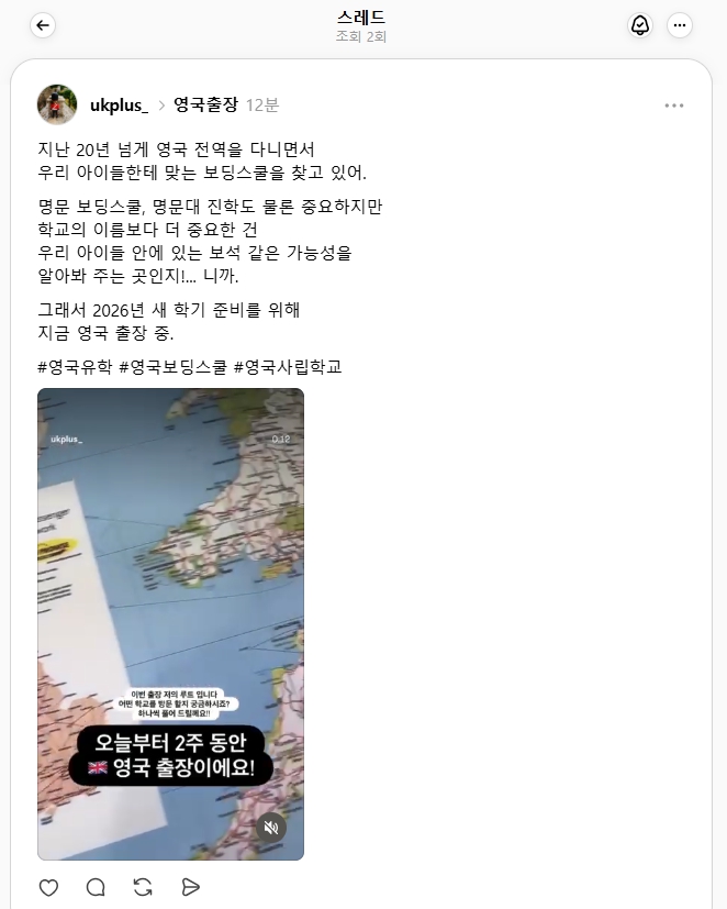 안녕하세요, UKPLUS NEWS 입니다지난 20년 넘게 영국 전역을 다니며우리 아이에게 가장 맞는 보딩스쿨을 찾고 있습니다.명문 스쿨, 명문대 진학도 중요하지만더 중요한 건우리 아이 안에 숨은 가능성을알아봐 주는 학교 인가?입니다.요즘은 미국 유학을 고민하시던 부모님들 중에서도전쟁이나 사회적 불안 때문에조금 더 안전하고 안정적인 환경을 찾으며영국으로 눈을 돌리는 경우가 많으신데요,저도 바로 그 이유로2026년 새 학기 준비와 함께지금 영국 출장 중입니다. UKPLUS를 통해유학을 가는 학생분들은웬만하면 학교가겹치지 않는 사실~알고 계신가요?가능성을 키워주는 학교를 찾아주고 싶은 부모님들께영국 보딩스쿨 이야기를 직접 전해드리고 싶습니다. https://www.instagram.com..